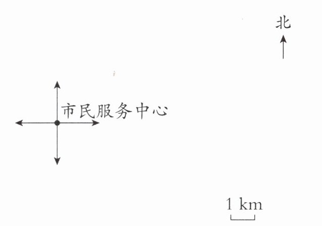 [点拨]根据“上北下南,左西右东”确定方向,根据图上一个单位长度代表1km确定距离。
