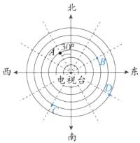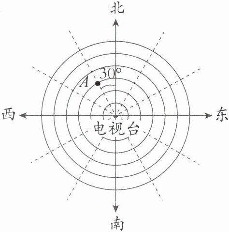 (1)在电视台“信号覆盖”示意图上,每相邻两个圆之间的距离都是5 km。以电视台为观测点,A点在北偏西30°方向15 km处,B、C、D点的位置分别如下,请在图上表示出来。(9分)