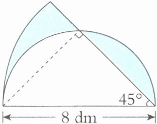 6.$\frac{45^{\circ}}{360^{\circ}}$×3.14×8²−8×(8÷2)÷2=9.12(dm²)[点拨]右边的涂色部分可以与左边的涂色部分拼在一起,则涂色部分的面积=扇形的面积−三角形的面积。