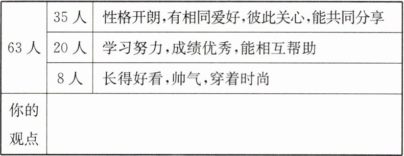 一个好的朋友应该具备什么样的条件?什么样的人才是大家眼中的好朋友呢?八班的同学就此在全班做了一个调查,下面是调查的结果。请根据调查结果写一篇调查报告。