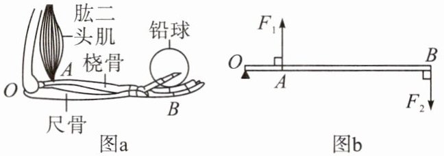 19. 如图a所示为前臂平伸用手掌托住铅球时的情形。我们可将图a简化成如图b所示的杠杆,不计自重。若铅球质量$m= 3kg$,$OA= 0.03m$,$OB= 0.30m$,求此时肱二头肌对前臂产生的拉力$F_{1}$的大小。($g取10N/kg$)