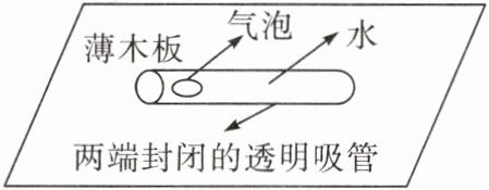 9. 如图所示是球球自制的水平仪,它由装有水和气泡且两端封闭的透明吸管固定在薄木板上组成的,用它能检查桌面是否水平。将它底边放在桌面上,如图所示,则该桌面______