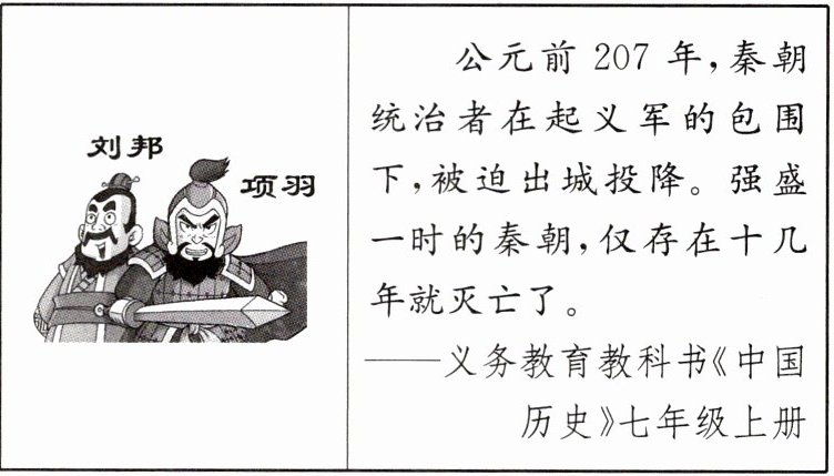 (3)根据材料三并结合所学知识,算算秦朝从建立到灭亡共存在多少年。谈谈图中的两位人物在推翻秦朝统治的斗争中各起到什么作用。(3分)