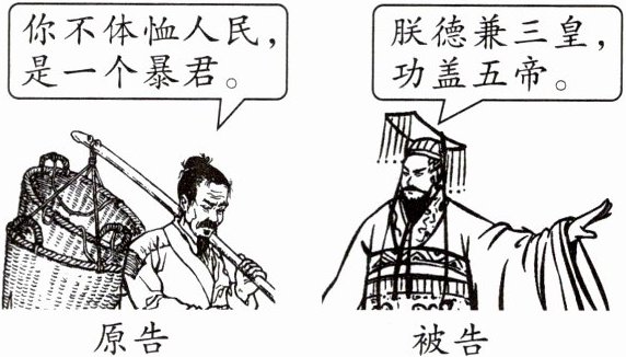 (2)秦始皇的辩词:“我”统一了全国,建立了中国历史上第一个统一多民族的封建国家;“我”统一了文字、货币、度量衡,促进了全国各地文化、经济的交流与发展。“我”是千古一帝,功德无量。(或秦朝人的诉状:你大兴土木,营建阿房宫、骊山陵,劳民伤财;你征收沉重的赋税,要我们将收获物的大部分交给你;你把严苛的法律强加在我们头上,让我们没有活路;你焚书坑儒,禁锢了思想,摧残了文化。你是一个暴君。)