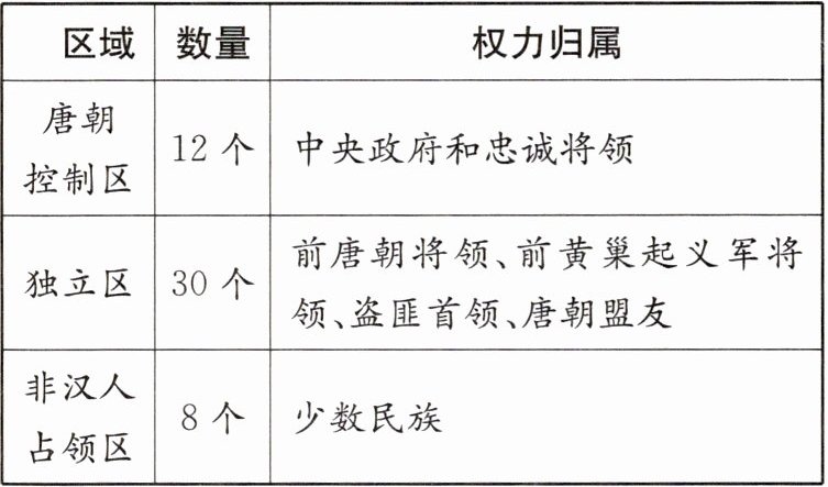 5.(内蒙古赤峰期末)下表是黄巢起义后,唐朝50个重点地区的地方权力分配表(885年)。对于下表解读正确的是()