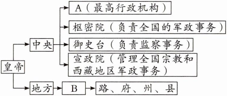 (2)材料二图中A代表的是哪一行政机构?结合所学知识指出图中B代表的行政区划。(2分)