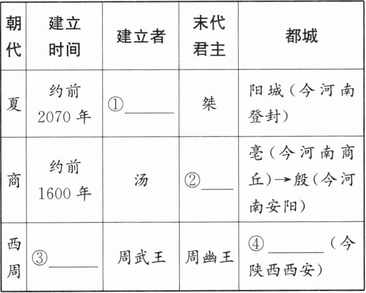 (1)①禹 ②商纣王 ③约前 1046 年 ④镐京
