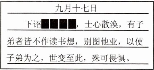 9.(河北中考)下图是山西举人刘大鹏在光绪三十一年(注:光绪元年为1875年)某天的日记,其中部分字迹印刷不清。这部分字迹应是(