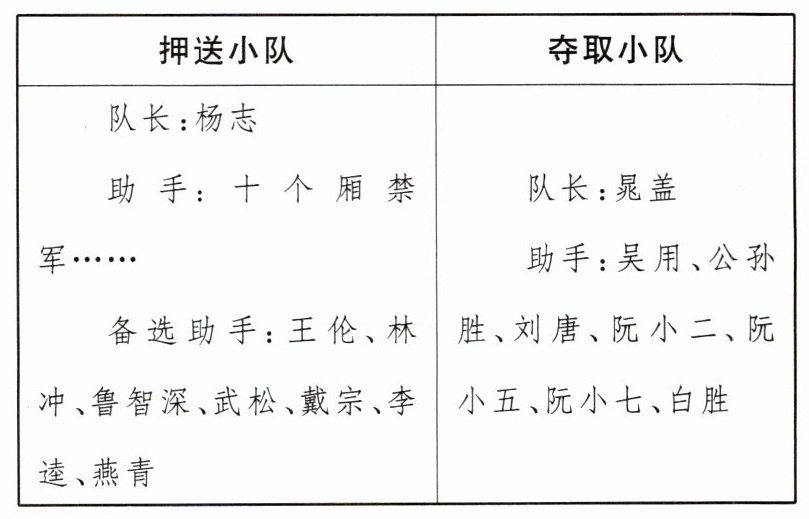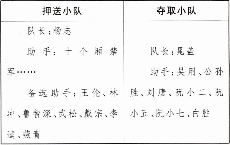 4. 阅读了《智取生辰纲》后,同学们打算对此情节进行改写,假如让杨志再次押送一批贵重货物前往东京,同时要一路上防范晁盖等人夺取货物。允许他从下面的备选助手中挑选一位,你认为杨志会选谁? 请结合名著内容和人物性格阐述你的选择理由。