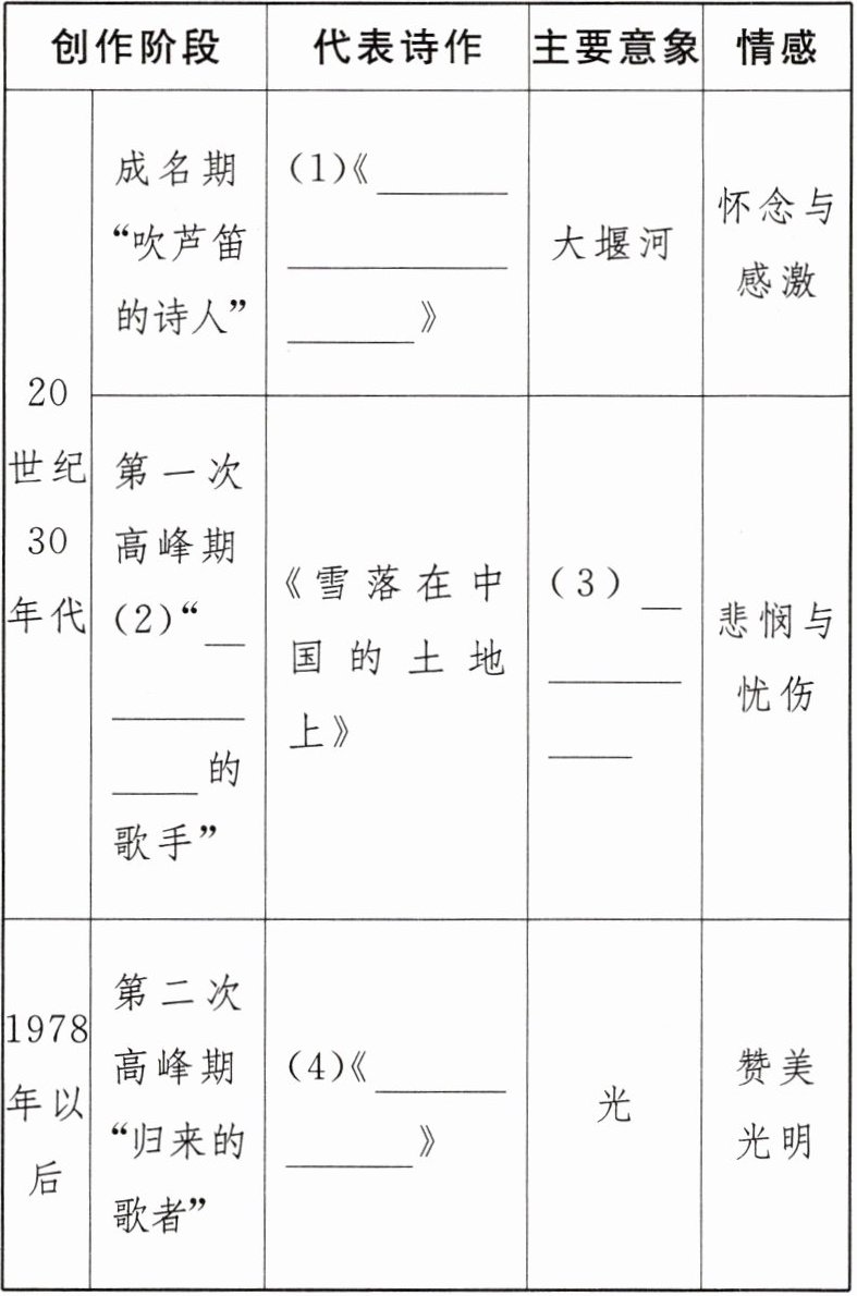 2. 班级开展《艾青诗选》阅读活动,小文借助这本书的序言,大致梳理了艾青诗歌不同创作阶段的特点。请你将空缺处补充完整。