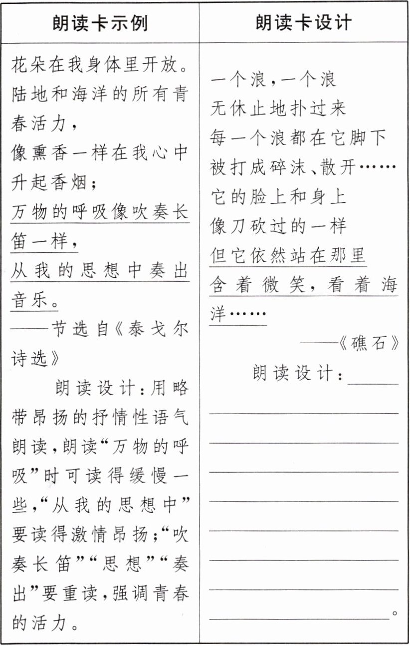 3. 朗诵社的同学准备向全校师生朗诵《艾青诗选》中的诗句,请你仿照示例,从语气、重音的角度,对右侧朗读卡中的画线诗句进行朗读设计。