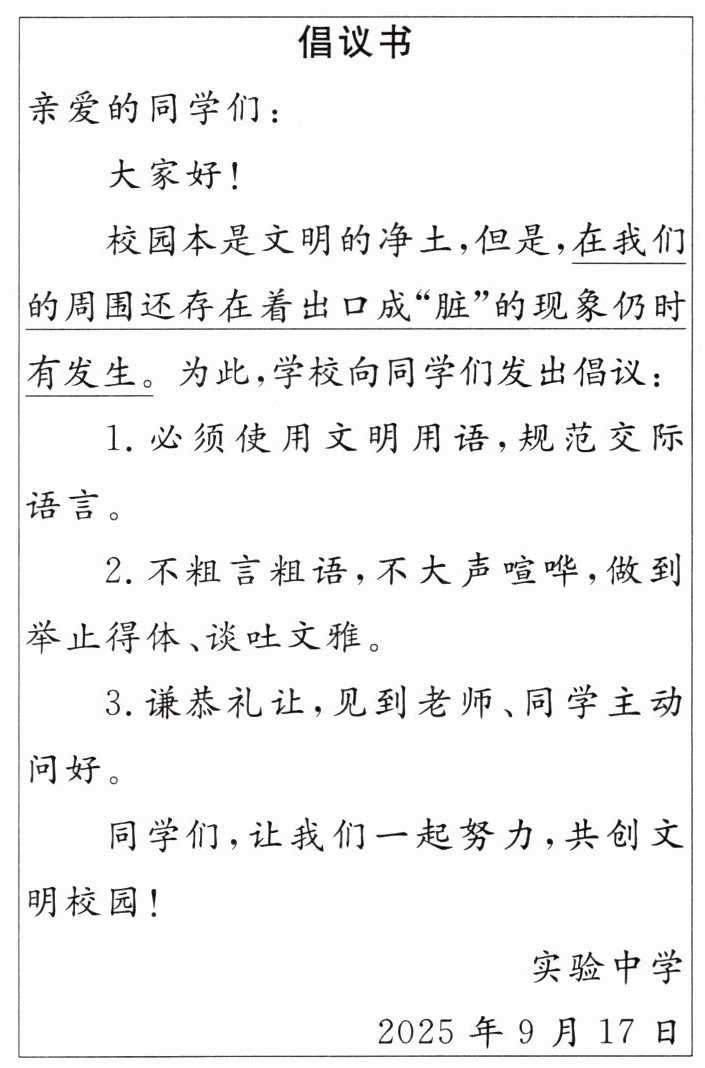 ”。②倡议书的格式有一处不规范,请提出修改意见: