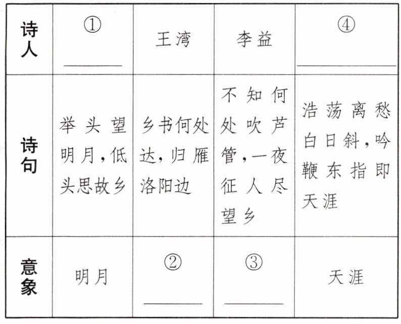 (3)“怀念故乡”是文学作品中经久不衰的主题,古人用各种意象来表达对家乡的思念,请你根据自己的积累,完成下面表格。(4分)