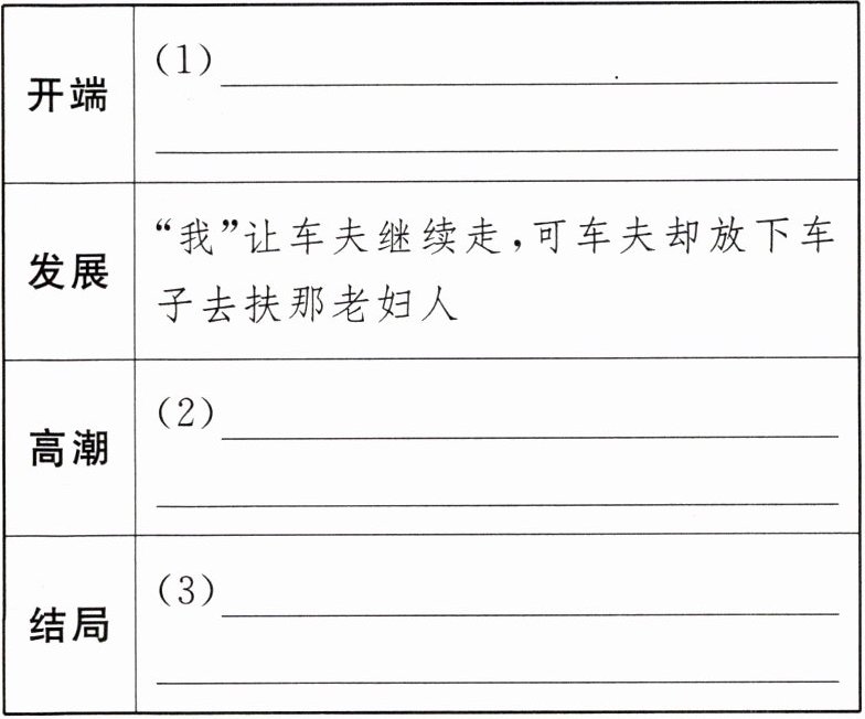 4. (☆课后习题一变式)请你梳理“一件小事”的开端、发展、高潮和结局,完成下面的表格。(3分)