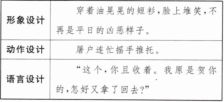 动作设计"连忙摇手推脱"不合理。(1分)胡屠户是见财心喜,假意推托(1分),原文"屠户把银子攥在手里紧紧的,把拳头舒过来"更细腻地写出了胡屠户市侩虚伪、嗜钱如命的嘴脸(2分)。