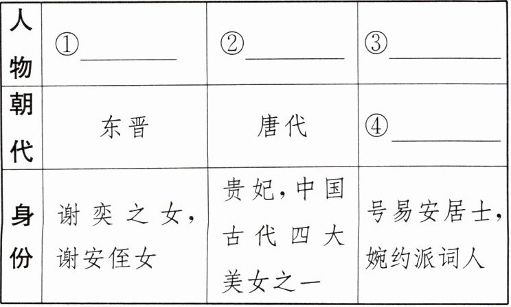 (3)“气质美如兰,才华馥比仙”指的是《红楼梦》中的妙玉。中国历史上不乏才貌双全的女子,请根据你的积累,完成下面的表格。(4分)