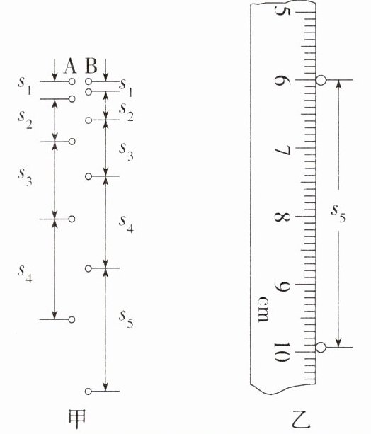(选填“A”或“B”)球。(2)用刻度尺分别测得照片上A、B两球相邻位置之间的各段距离,A、B两球相对应的$s_{1}$、$s_{2}$、$s_{3}$、$s_{4}$的测量结果如图表所示。测量照片上B球相邻位置之间的距离$s_{5}$时,刻度尺的示数如图乙所示,则$s_{5}= $
