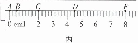 实验中打出一条纸带如图丙所示,纸带上标出了 A、B、C、D、E 连续五个点,请你读出 A 点到 E 点的距离为____cm。通过实验计算出小车在 A、E 之间运动的平均速度是____m/s,小车做____直线运动。