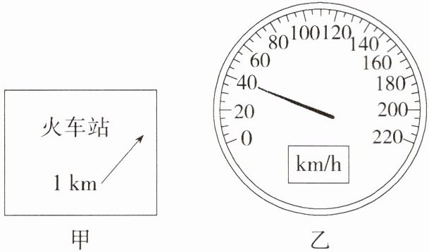 答案 此地距离火车站还有1 km 匀速直线运动 解析 图甲所示指示牌的含义是此地距离火车站还有1 km。图乙速度表显示的是汽车此时行驶的速度,忽略速度的变化,利用$v=\frac{s}{t}$可估算到达火车站所用的时间,即解决这个问题,首先应抓住影响这个问题的主要因素——汽车的速度,建构匀速直线运动模型进行探究。