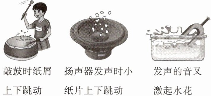 解析 题图所示的三个实验,通过纸屑、小纸片和水花放大了发声体的振动,说明声音是由物体的振动产生的。