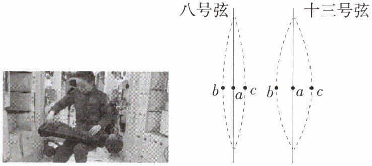 10.「2024安徽宣城期末,☆☆」如图所示,王亚平在“天宫”弹奏古筝,分别拨动古筝的八、十三号弦,用同一设置的相机拍摄到两弦最左摆到b处,最右摆到c处,静止时在a处。测出每振动880次,八号弦用时2s,十三号弦用时4s,则八号弦(