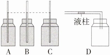 12. 新特色 教材习题变式 [2025内蒙古呼和浩特期中,★☆]学习了自制温度计后,实践小组同学尝试自制温度计,用玻璃小药瓶、透明吸管、红墨水等器材制成了图中A、B、C、D四支温度计并标有刻度(刻度未画出),其中A、B、C三支温度计的小药瓶中装满红色的水,D温度计的小药瓶是空的,液柱用的也是红色的水。