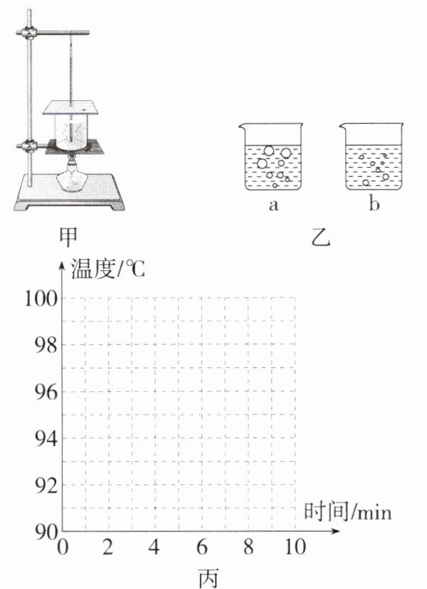 ① 第 $ 2 \min $ 时,他们观察到烧杯中气泡的情形如图乙中的____(选填“a”或“b”)图。