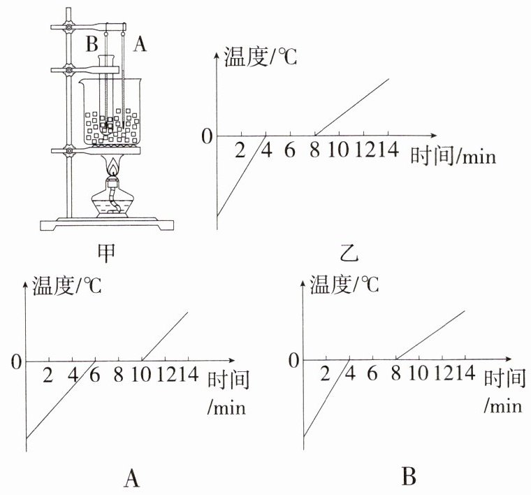 2.「2025河北衡水六校联考」如图甲所示,在试管和烧杯中分别放入适量的碎冰,再把试管放入烧杯中,然后点燃酒精灯。图乙是烧杯中的温度计A的示数随时间变化的图像,已知试管内的冰熔化过程历时4min,则试管中温度计B的示数随时间变化的图像可能是(