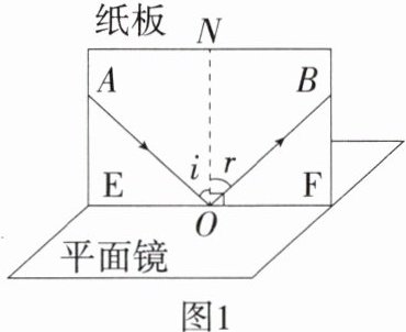 (3)如图1,让一束光贴着纸板E沿着AO方向射向镜面,在纸板F上可看到反射光沿OB方向射出,用笔在纸板上描出入射光AO和反射光OB的径迹,AO与垂直于镜面的直线ON的夹角i是入射角,OB与ON的夹角r是反射角,多次改变入射角i的大小,实验所测数据如表。实验中,直线ON相当于