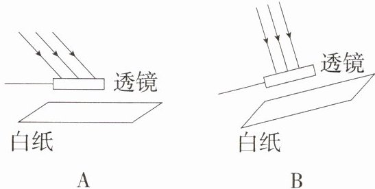 (1)太阳光平行于主光轴入射,经凸透镜折射后会聚在焦点上,如图所示的两种操作方案中,正确的是图B所示方案。