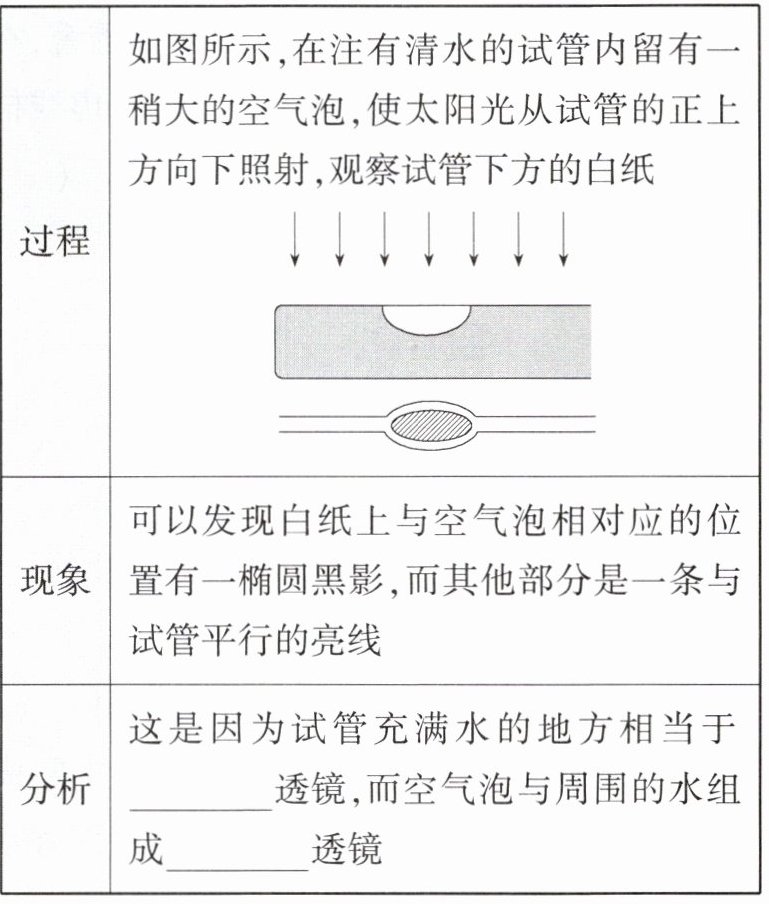 解析 试管充满水的地方,中间比边缘厚,相当于凸透镜,凸透镜对光有会聚作用,会聚成一条亮线;由于空气泡的存在,空气泡与周围的水形成中间薄、边缘厚的凹透镜,凹透镜对光具有发散作用,在空气泡下方对应的位置有黑影。