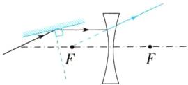 16. 「2023 湖北恩施中考,★☆」如图,一束光经平面镜反射后,平行于凹透镜的主光轴射向透镜,请画出平面镜和经过凹透镜后的折射光线。