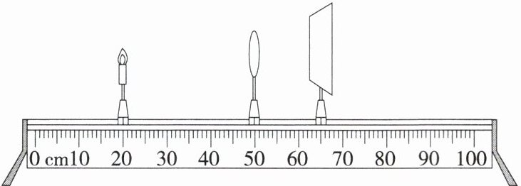 7. 某同学做“探究凸透镜成像规律”的实验,将凸透镜、蜡烛和光屏移至如图所示的位置时,光屏上出现了烛焰清晰的像。她接着将蜡烛移到 35 cm 刻度线处,保持透镜的位置不变,应将光屏移至