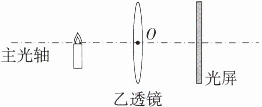8. 甲、乙、丙三个凸透镜的焦距的大小关系为$ f_{\text{甲}} > f_{\text{乙}} > f_{\text{丙}} $,如图所示,用乙透镜进行实验,物体到透镜的距离等于它的两倍焦距时,光屏上成清晰的等大、倒立的像;用甲、丙透镜进行实验时,只把透镜放在乙透镜原来的位置,不改变物距,前后移动光屏,以下判断正确的是(
