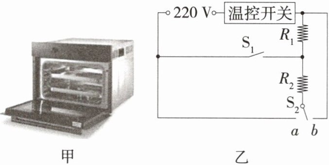 3.跨学科 日常生活 「2024 山东德州中考」图甲是一款家用蒸箱,图乙是其加热盘模块的简化电路,蒸箱有“低温”“中温”“高温”三挡,其中$R_{1}$、$R_{2}$为阻值不变的电热丝,当开关$S_{1}$断开、$S_{2}$接 a 时,蒸箱处于