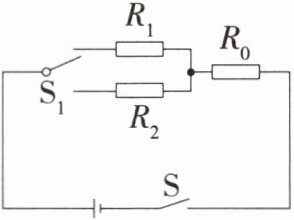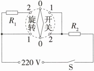 1.如图是一款电饭锅的简化电路图,旋转开关可以实现加热或保温功能,已知加热挡的功率是 1 000 W,$R_{1}$、$R_{2}$为定值电阻,$R_{1}的阻值是R_{2}$阻值的 19 倍,闭合开关 S,当旋转开关旋转到触点