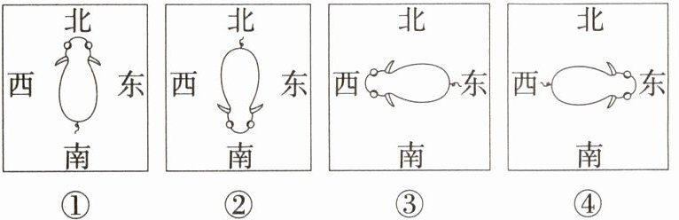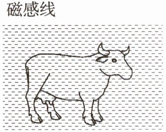 10. 新逆向思维 [2024江苏常州中考, ]美国《发现》网站于2023年10月报道:“牛能感知地球磁场,吃草、休息时,其身体朝向习惯与地磁场磁感线平行(如图所示)。”为求证真伪,同学们设计如下实验方案:在四周无明显差异的草地上,多次观察牛吃草、休息时的身体朝向,若报道真实,则牛的身体朝向习惯性呈现四个场景中的(