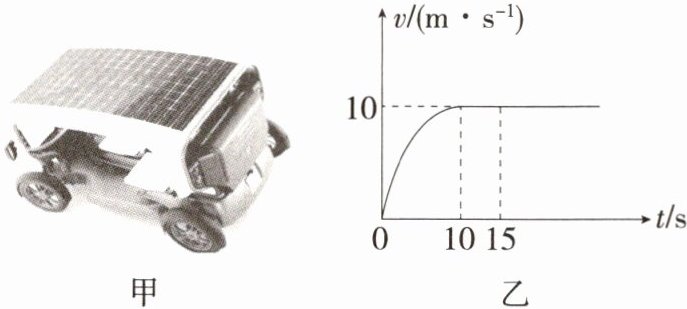 1.跨学科社会发展「2024黑龙江大庆中考」如图甲是某新型太阳能汽车,该汽车的动力完全由安装在车顶的电池板收集的太阳能提供。接收太阳能的电池板面积为$6m^2。$某次试车过程中,该车在水平路面上以恒定功率P做直线运动,v-t图像如图乙所示。已知,汽车(包括司乘人员)的总质量为480kg,汽车行驶过程中所受阻力大小为车重的0.02倍,取g= 10N/kg。求: