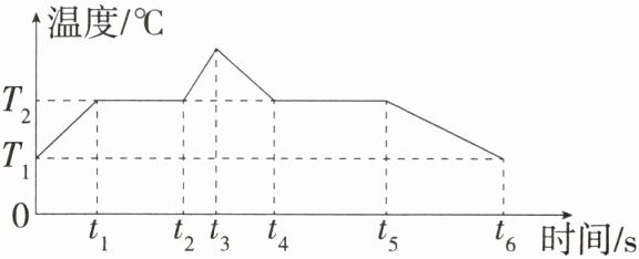 5. 「2024四川成都中考,☆☆」某固态物体的质量为m,其物质的比热容为c,用稳定的热源对它加热(物体在相同时间内吸收的热量相等),到t_{3}时刻停止加热,然后让其冷却。上述过程中记录不同时刻的温度,最后绘制出温度随时间变化的图像(如图)。下列说法正确的是(