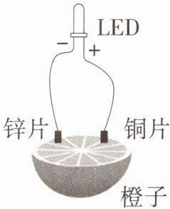 6.新中考创新实验「2025甘肃定西期中」在橙子上插入铜片和锌片后制成水果电池,将水果电池与发光二极管(简称“LED”)连接成如图所示电路,LED发光。下列说法正确的是(