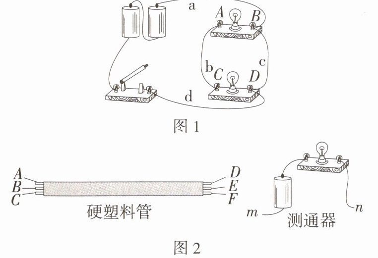 (2)①连接A和B,将测通器的m端连接在D上。当n端连接F时小灯泡发光,则ABDF形成通路,由此可确定C、E为同一根导线的两端;②已确定C、E为同一根导线的两端,当连接A和C时,测通器的一端必须与E相连,另一端只需接触一根导线就能将两根导线辨别开。当与D接触时,若小灯泡发光,说明A和D、B和F分别为同一根导线两端,若不发光,说明A和F、B和D分别为同一根导线两端。