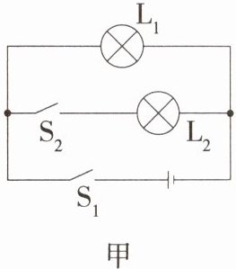 10.新课标科学思维「2024山东临邑期末,☆☆」小明连接的电路如图甲所示,闭合开关S后,发现小灯泡$L_1、$$L_2$均不发光,他将一根导线分别接在小灯泡$L_1、$$L_2$的两端,如图乙、丙所示。闭合开关S后(