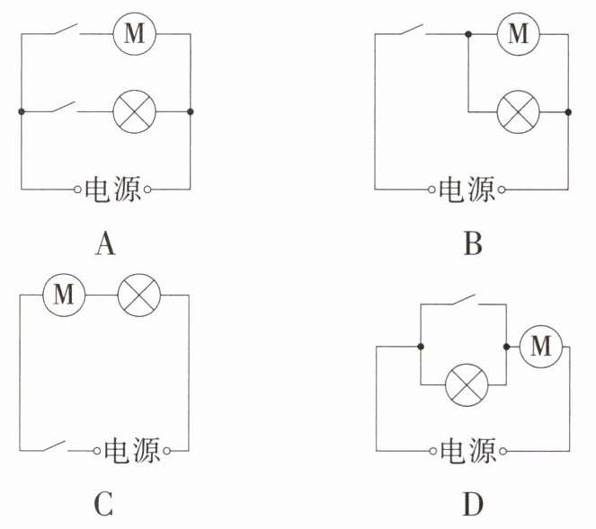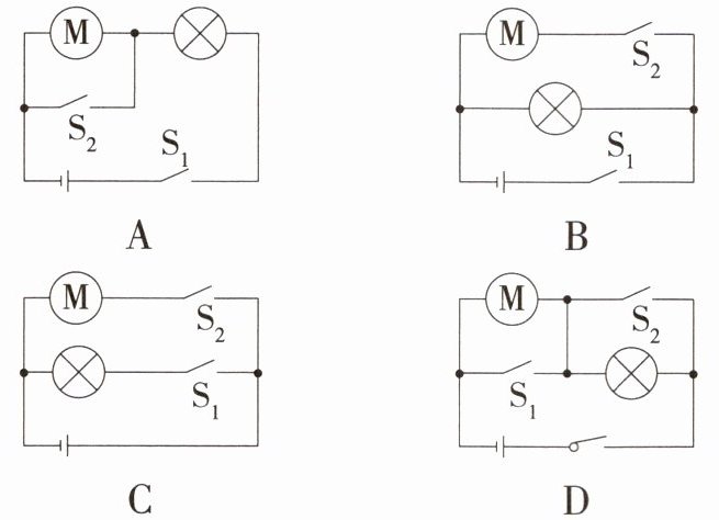 4. 跨学科日常生活「2024四川巴中中考」为了减少炒菜时对油烟的吸入,厨房里安装了一台抽油烟机。抽油烟机上面的照明灯和电动机既可以同时工作又可以独立工作。以下关于抽油烟机内部电路设计,你认为符合要求的是 (
