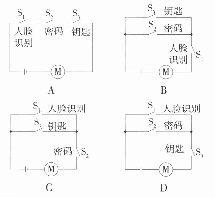 B 由题意知,“人脸识别”与输入“密码”匹配成功,或“人脸识别”与使用“钥匙”匹配成功才可开锁,说明二者中有一个条件满足,电动机就工作,所以“人脸识别”开关与电动机应在干路上,“密码”开关与“钥匙”开关是并联的,故选B。