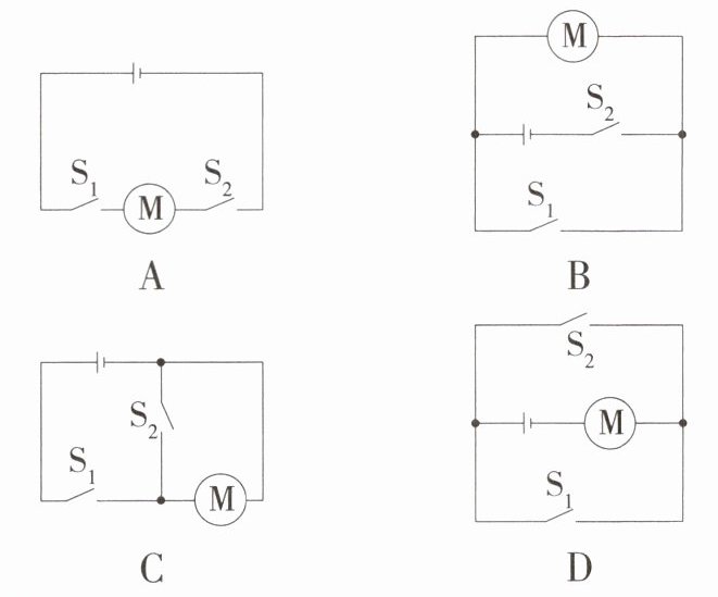 D 根据题意知,两个开关都可以单独使电动机工作而打开门锁,两个开关应是并联的,而且电动机位于干路,故选D。