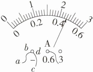 答案:0.46 0.76 解析:由图可知,电流表选择0~0.6A量程,分度值为0.02A,示数为0.46A;电流表的正确接法是电流从“ + ”接线柱流入,从“ - ”接线柱流出,若导线ab中的电流方向为a→b,根据电流的走向,则ab中的电流及通过电流表的电流,均通过cd导线,此时I_cd = 0.3A + 0.46A = 0.76A。