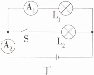答案:不变 1.76 解析:在图丁所示的电路中,S断开时,电路中只有灯泡L₁工作;S闭合时,两灯并联,A₁测L₁所在支路的电流;因并联电路中各支路互不影响,则电流表A₁的示数不变;S闭合时,该电路为并联电路,A₁测通过L₁的电流,A₂测干路中的电流;A₁和A₂的指针位置相同,由于并联电路中,干路电流大于任何一条支路中的电流,所以A₂选用的是大量程,分度值为0.1A,示数为2.2A;A₁选用的是小量程,分度值为0.02A,示数为0.44A;根据并联电路的电流关系可知,通过L₂的电流为I₂ = I - I₁ = 2.2A - 0.44A = 1.76A。