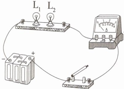 12. 如图所示,两灯泡 $ L_1 $、$ L_2 $ 在盒内的连接方式未知,电源电压一定,开关闭合后两灯泡均发光,电流表的读数为 1.2 A;若把 $ L_1 $ 取下,$ L_2 $ 仍发光,电流表读数变为 0.3 A,则 $ L_1 $ 和 $ L_2 $ 是