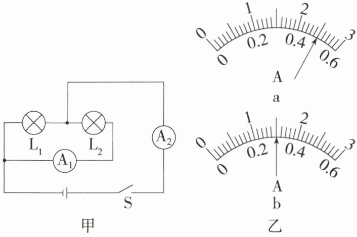 17. 某同学在做“用电流表测量电流”的实验中所用的电路如图甲所示,他按电路图正确连接电路并闭合开关 S 后,电流表 $ A_1 $、$ A_2 $ 的指针位置分别如图乙中 a、b 所示。则: