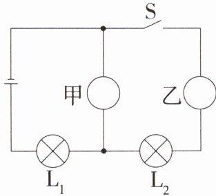 3. [2025福建福州十九中期中]如图所示电路中,甲、乙是两只电表(电流表或电压表),闭合开关后,两灯均能发光,请在图中画出甲、乙分别是什么表。